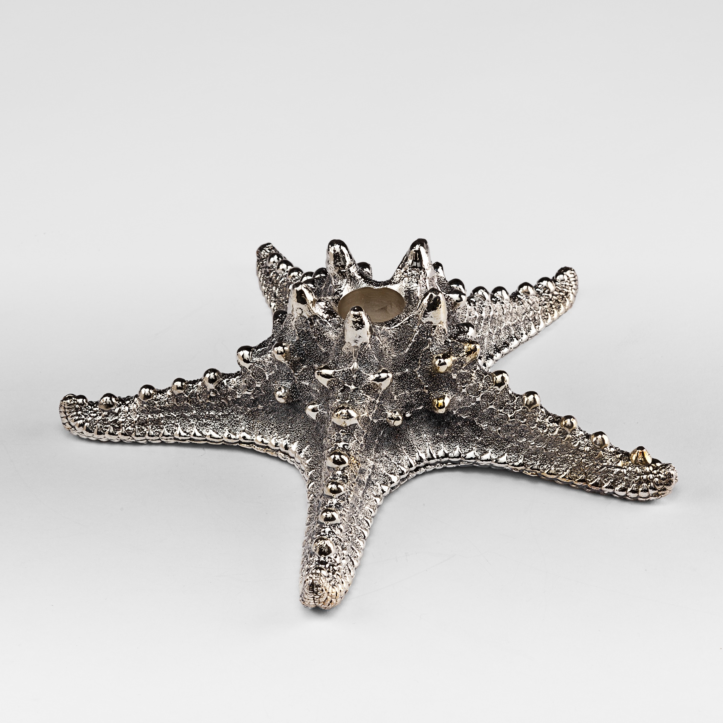 Silver Starfish Galeazzo candlestick. Candlestick is available in one size. Silverplate on resin. Creel and Gow has been working with the same atelier in Rome, Italy for over 20 years to make our signature silvered shells. Our workshop has been operated by the same family for generations. For decades, this family has also done restoration work on silver pieces for the Vatican.