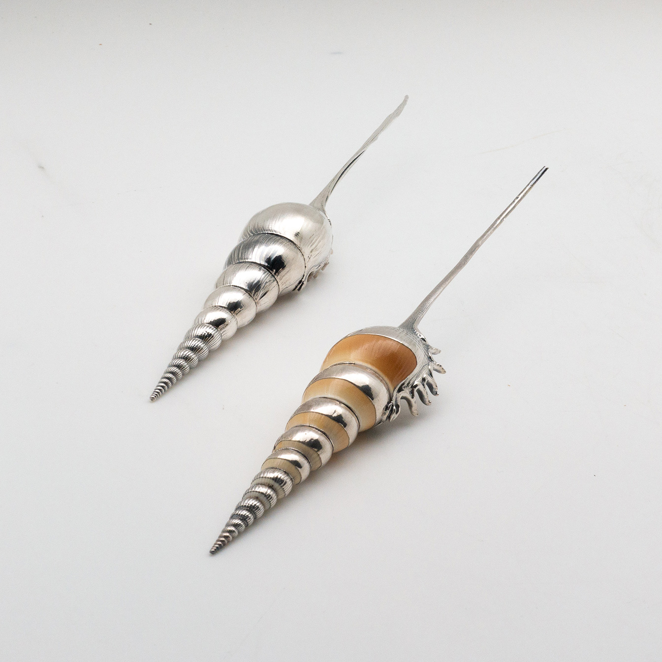 Silvered Tibia Fusus Shell. 6". Available in silvered and partially silvered. Each shell is unique. Creel and Gow has been working with the same atelier in Rome, Italy for over 20 years to make our signature silvered shells. Our workshop has been operated by the same family for generations. For decades, this family has also done restoration work on silver pieces for the Vatican.