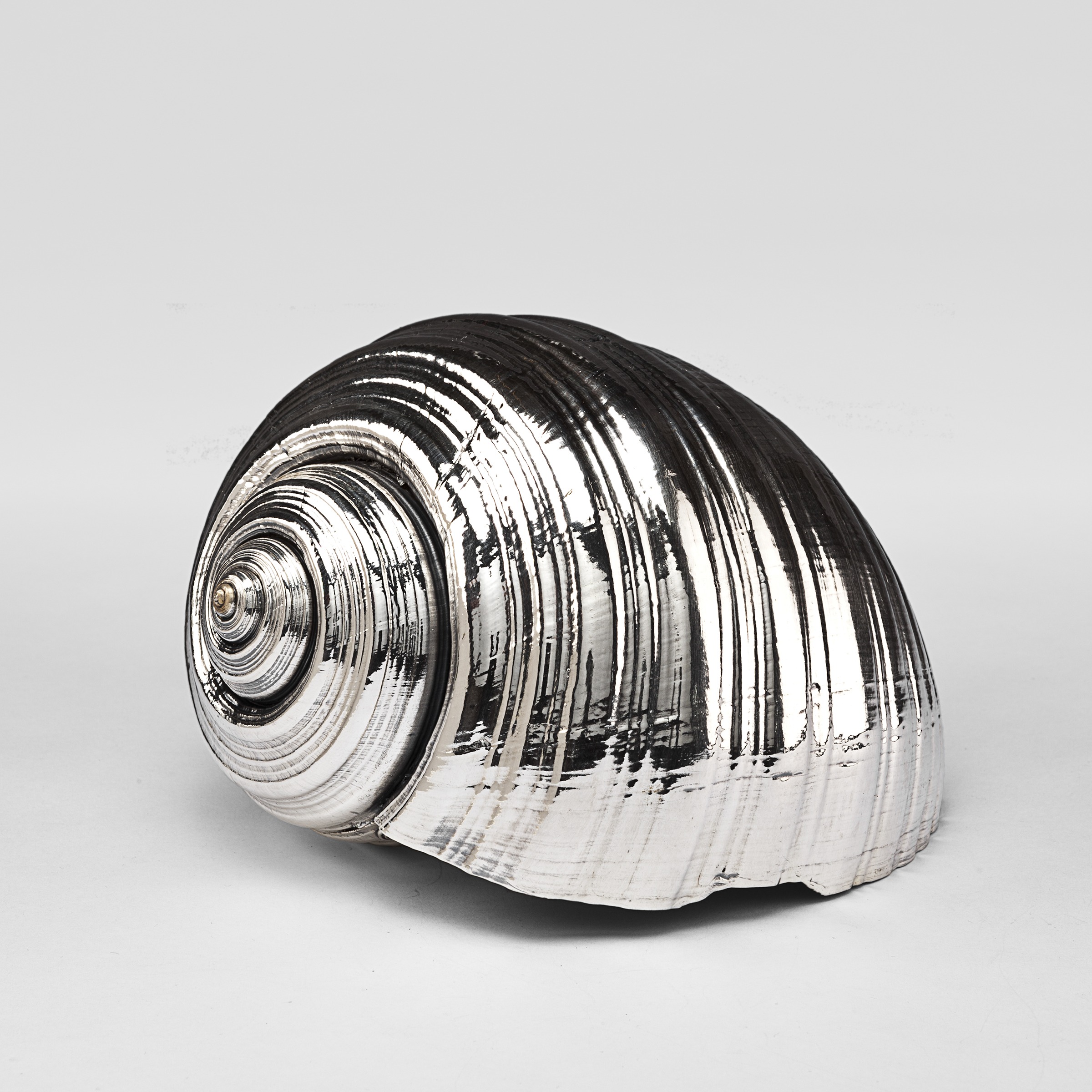 Silvered Tonna Shell. Available in 3",4",5",6",7"and 8". Each shell is unique and created by hand. Creel and Gow has been working with the same atelier in Rome, Italy for over 20 years to make our signature silvered shells. Our workshop has been operated by the same family for generations. For decades, this family has also done restoration work on silver pieces for the Vatican.