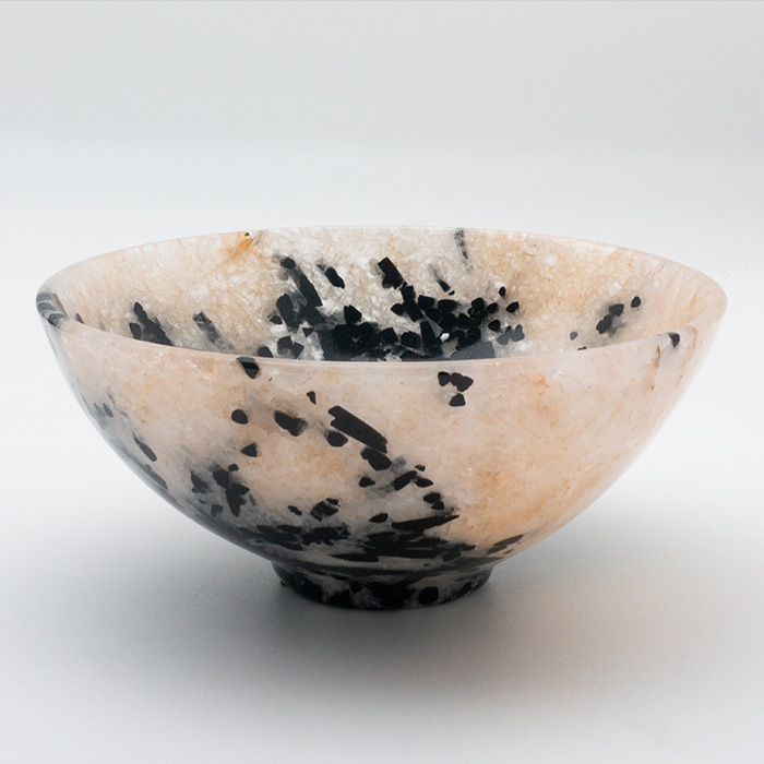 Black tourmaline in quartz bowl, 6" diameter. This bowl was carved from a specimen of cream-colored quartz with needles of black tourmaline shooting through.