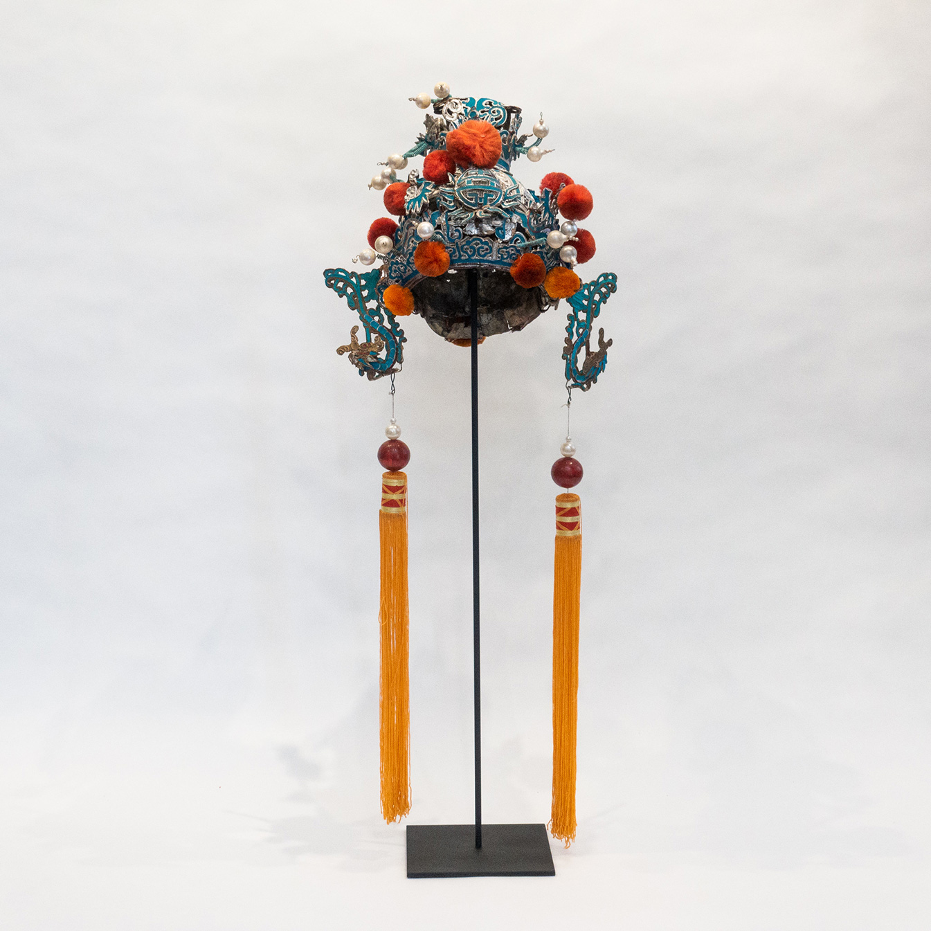 Vintage Chinese opera theatre headdress in turquoise and silver colors with orange pom poms, early 20th century, mounted on a custom, black painted metal base.